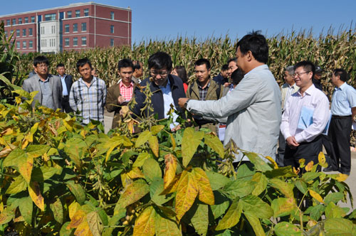 在長春綜合農業試驗站,陰和俊副院長實地考察了玉米育種試驗田、超高產耐鹽堿東稻4號水稻新品種示范田、高光效新型種植模式示范田、大豆分子育種種質資源圃,關義新、楊福、劉景雙和馮獻忠研究員分別就試驗區的試驗設置、研究內容及取得進展做了匯報。陰和俊副院長對我所近年來取得的一系列成果給予了肯定,并就成果的投入成本、效益提升及應用推廣情況等問題進行了細致的了解。