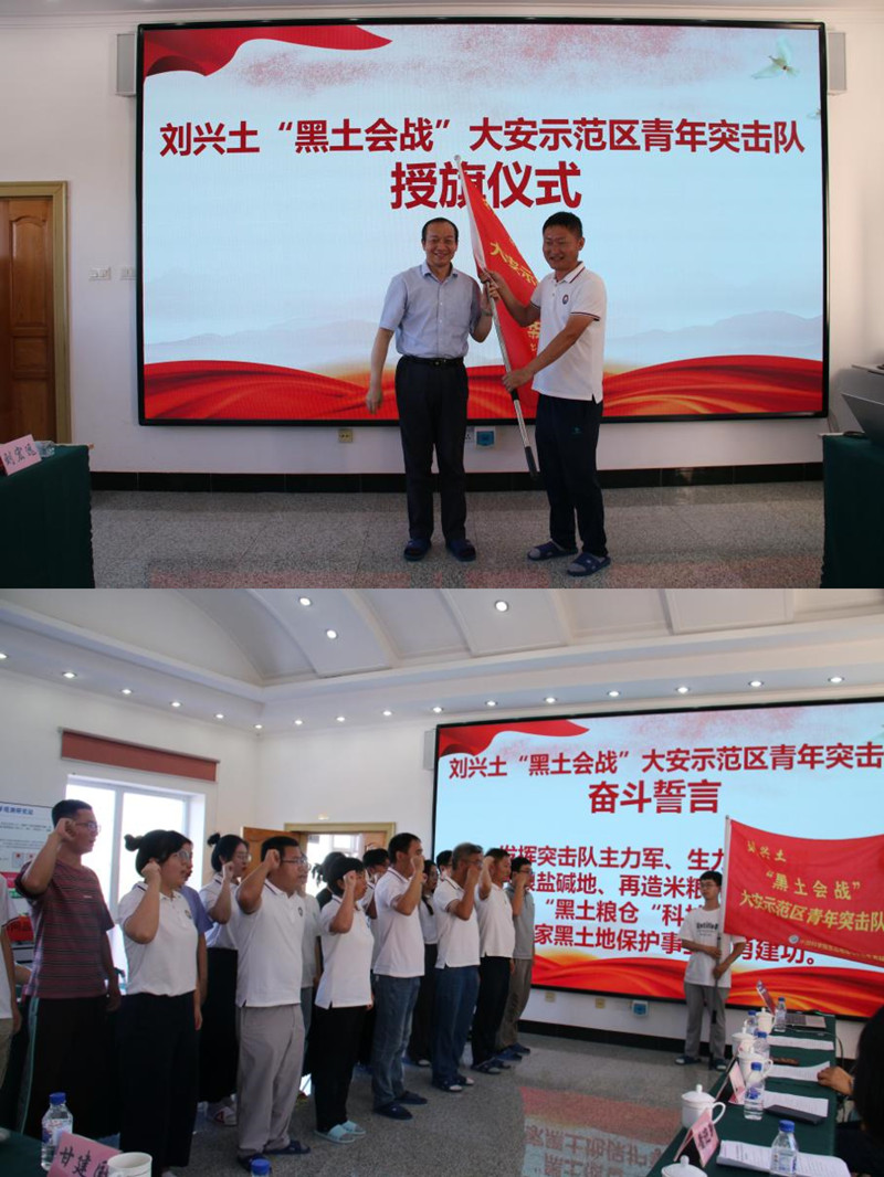 座談會上舉辦了以老科學(xué)家命名的突擊隊授旗儀式。文波龍副研究員簡要介紹劉興土院士先進事跡,李和風(fēng)向劉興土“黑土?xí)?zhàn)”大安示范區(qū)青年突擊隊授旗,青年突擊隊進行奮斗誓言宣誓,錚錚誓言,體現(xiàn)了新一代的科研工作者以老科學(xué)家精神為引領(lǐng),緊密圍繞國家重大戰(zhàn)略需求奮勇建功的信心和決心。