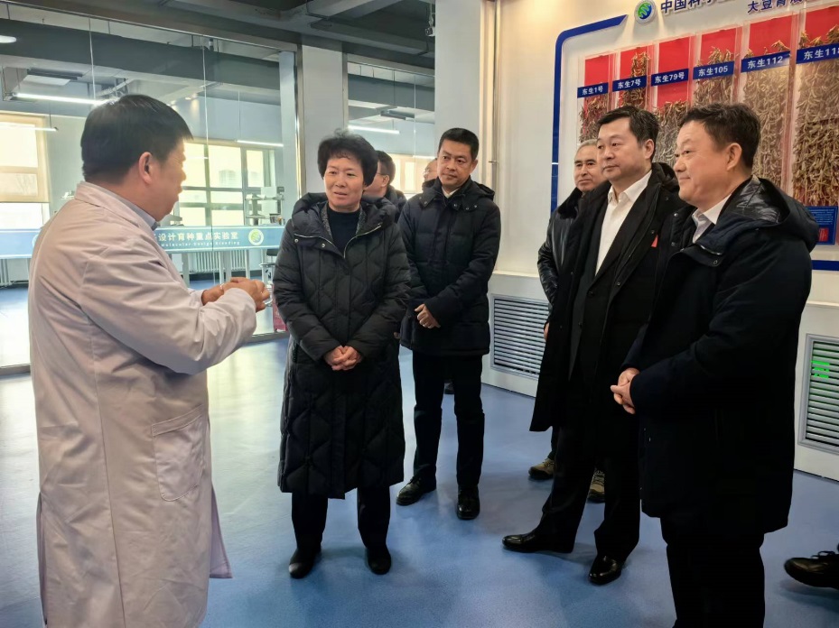 在種質資源樓,吳海英調研了大豆分子設計育種重點實驗室,現場查看了大豆基因突變體庫、大豆分子設計育種技術體系、高通量作物表型組分析系統及“東生”系列大豆新品種選育與轉化工作。