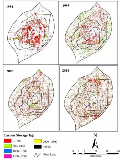 研究團(tuán)隊(duì)?wèi)?yīng)用遙感與實(shí)地測(cè)量相結(jié)合的方法,構(gòu)建了城市森林碳儲(chǔ)量時(shí)空估測(cè)模型,揭示了快速城市化過(guò)程中城市森林結(jié)構(gòu)及其碳儲(chǔ)量的時(shí)空演變規(guī)律。研究發(fā)現(xiàn),快速城市化過(guò)程中,城市森林覆蓋度總體呈現(xiàn)出逐漸增加的變化趨勢(shì),但其斑塊破碎化逐漸加重;城市森林郁閉度、葉面積、基部斷面積等都呈現(xiàn)出逐漸降低的變化趨勢(shì)。在城市森林減緩碳排放方面,研究團(tuán)隊(duì)明確了快速城市化過(guò)程中城市森林在應(yīng)對(duì)城市碳排放中的貢獻(xiàn):在1984~2014年間城市森林碳儲(chǔ)量逐漸增多(大多集中于郊區(qū)),其年增加量為6Gg,可抵消年增加CO2排放量的4%。城市森林碳密度呈現(xiàn)出從郊區(qū)到中心逐漸降低的變化趨勢(shì),但隨著時(shí)間的推移,城市森林質(zhì)量有所提高,城市森林碳密度逐漸升高。