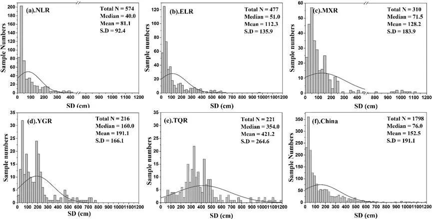 圖2 不同湖區(qū)湖泊透明度頻率直方圖