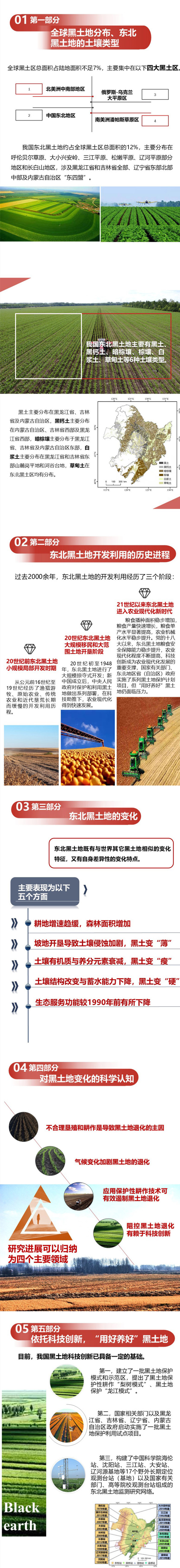 白皮書(shū)共分為五個(gè)部分。第一部分闡述了全球黑土地分布、東北黑土地的土壤類型;第二部分為東北黑土地開(kāi)發(fā)利用的歷史進(jìn)程;第三部分為現(xiàn)階段東北黑土地的變化;第五部分為依托科技創(chuàng)新,“用好養(yǎng)好”黑土地。未來(lái)“用好養(yǎng)好”黑土地研究的重點(diǎn)方向主要為五個(gè)方面:構(gòu)建黑土地科技創(chuàng)新基礎(chǔ)科技平臺(tái),摸清黑土地本底狀況,提升科技支撐能力;建立黑土地保護(hù)與利用科技創(chuàng)新體系,增強(qiáng)區(qū)域自主創(chuàng)新能力;打造黑土地保護(hù)科技攻關(guān)樣板,推進(jìn)黑土地高質(zhì)量發(fā)展;完善黑土地保護(hù)與利用技術(shù)標(biāo)準(zhǔn)體系,引導(dǎo)保護(hù)利用發(fā)展方向;加強(qiáng)國(guó)際合作交流,積極參與全球黑土地保護(hù)與利用治理。