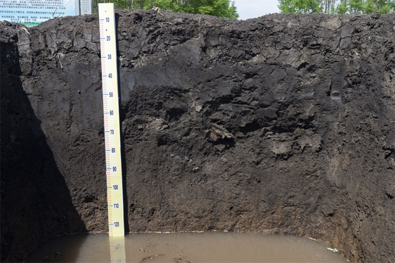 黑龍江省海倫市前進鎮(zhèn)自新村農(nóng)業(yè)科技示范基地內(nèi)一處用來觀測黑土層厚度的土壤剖面(5月23日攝)。