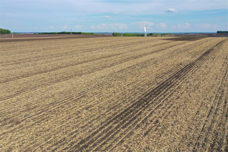 位于黑龍江省海倫市前進鎮(zhèn)光榮村的一片利用秸稈覆蓋免耕技術(shù)實施保護性耕作的黑土耕地(5月23日攝,無人機照片)。