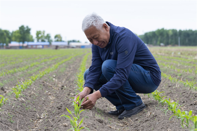 5月25日,在黑龍江省安達市羊草鎮(zhèn)安樂村,羊草鎮(zhèn)鄉(xiāng)村振興服務(wù)中心主任張寶慶查看玉米長勢。