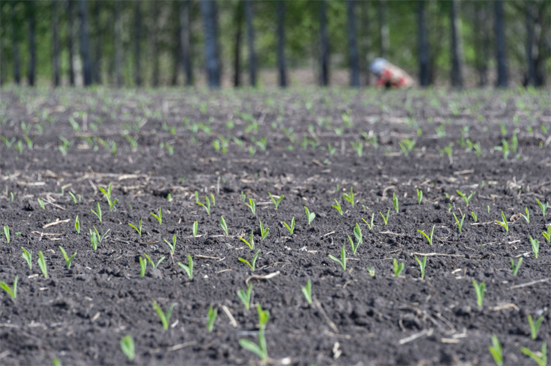 黑龍江省海倫市前進鎮(zhèn)光榮村一片黑土耕地內(nèi)剛出苗的玉米(5月23日攝)。