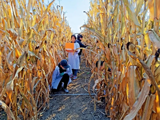 中科院沈陽應(yīng)用生態(tài)研究所張旭東研究員團隊成員在保護性耕作研發(fā)基地測玉米產(chǎn)量。