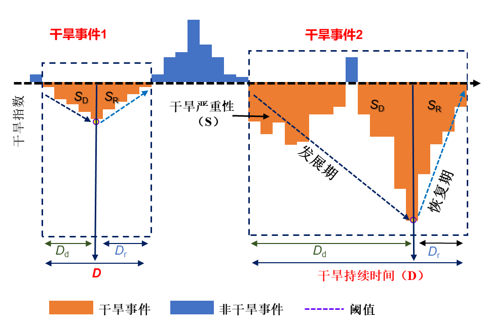 干旱是人類面臨的主要自然災(zāi)害,即使在科技發(fā)達(dá),它造成的災(zāi)難性后果仍然比比皆是。干旱的特征可從強(qiáng)度、頻次、持續(xù)時(shí)間和嚴(yán)重性等方面來表征,也可以將干旱事件分為發(fā)展期和恢復(fù)期兩個時(shí)段更深入的認(rèn)識干旱特征(圖2)。此外,干旱會發(fā)生不同類型的轉(zhuǎn)化,如持續(xù)的氣象干旱導(dǎo)致江河徑流、水庫和湖泊水位及地下水位下降,引發(fā)水文干旱。