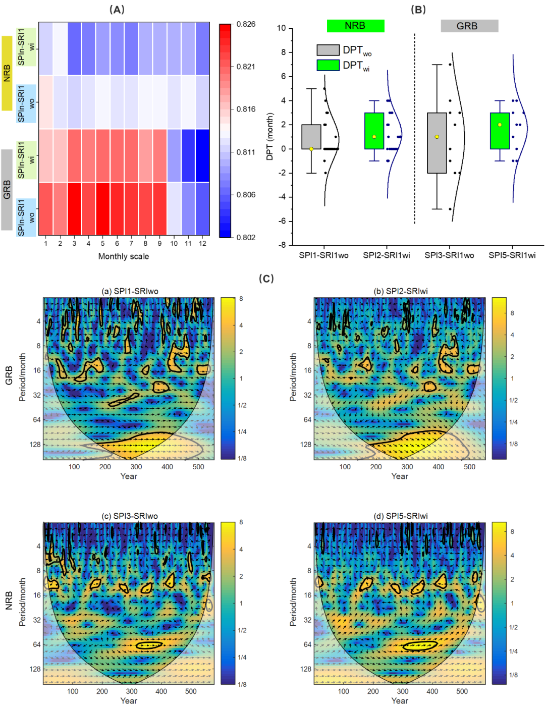 圖4 濕地對氣象干旱-水文干旱的相關(guān)性(A)、傳播時(shí)間(B)和響應(yīng)周期(C)的影響