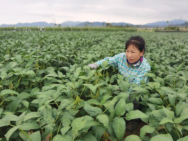 在黑龍江省齊齊哈爾市依安縣太東鄉(xiāng),李艷華在田里查看豆株。受訪者供圖