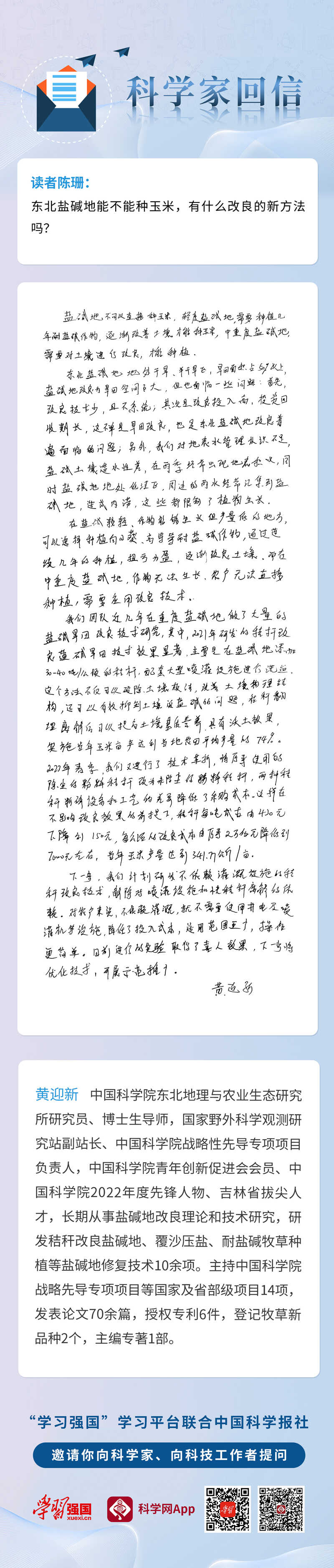 編者按:2023年5月起,“學習強國”學習平臺與中國科學報社聯合發起“科學家回信”活動,邀請廣大讀者向自己心中向往尊敬的科學家、科技工作者提問、留言。活動啟動后,“學習強國”“科學網App”收到了讀者的踴躍留言。我們精選了讀者陳珊的提問,請中國科學院東北地理與農業生態研究所研究員、博士生導師黃迎新發出第四十一期回信。