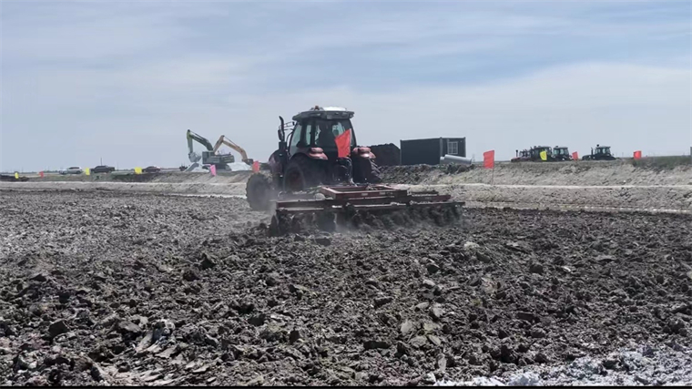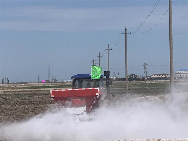 在連片的另一處鹽堿地塊,一車車磷石膏和有機肥被均勻拋撒到鹽堿地上,隨后上場的是農用旋耕機,旋耕機上場主要是把平鋪在鹽堿地上的酸性磷石膏和有機肥與耕層土壤均勻混合,起到均勻改良耕層土壤作用,同時防止改良劑被大風吹跑。 對于蘇打鹽堿地治理與綜合利用,大安站可謂是一馬當先,創新引領,前瞻布局,已有20余年的創新科研實踐經驗。站長梁正偉率領一支團隊在這片昔日寸草不生的重度鹽堿地上默默耕耘精心鉆研,提出了“良田、良種、良法”6字方針改造鹽堿地的基本理論,率先創建了“良田+良種+良法”三良一體化高效治理與綜合利用技術模式。