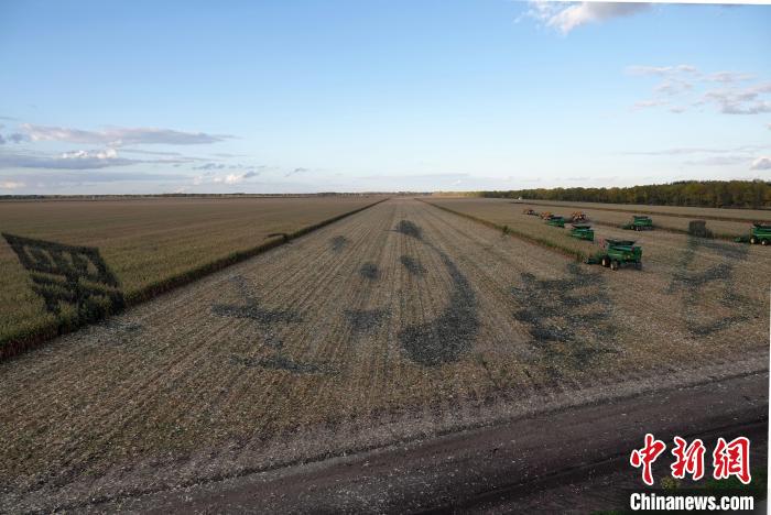 友誼農(nóng)場(chǎng)“萬畝大地號(hào)”上,農(nóng)機(jī)進(jìn)行作物收割作業(yè),場(chǎng)面壯觀。中新網(wǎng)記者 孫自法 攝