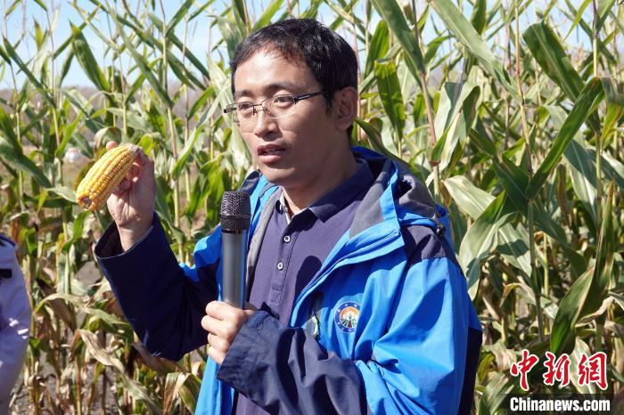 友誼農(nóng)場(chǎng)一處玉米示范地里,劉煥軍研究員接受媒體采訪介紹“三江模式”。中新網(wǎng)記者 孫自法 攝