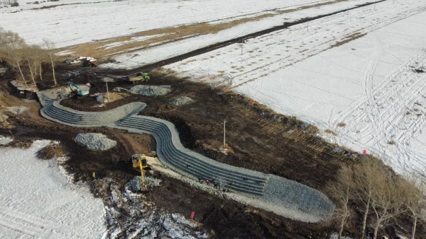 在黑龍江省克山縣華安村,工人們正抓緊建設溝頭跌水中的上游生態袋導水地下工程。農民日報·中國農網記者 顏旭 攝