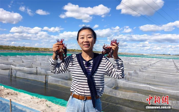 9月9日,吉林大安,王秋舉展示鹽堿地里養殖的小龍蝦。 中新社記者 郭佳 攝