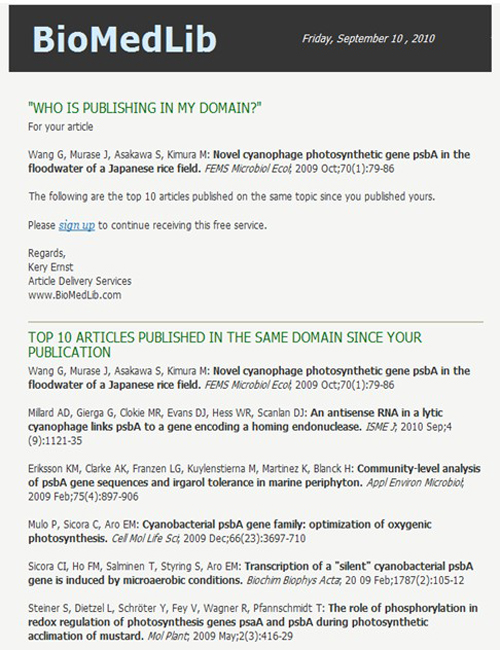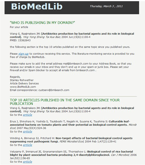 BioMedLib是生物醫(yī)學科技搜索引擎。在MEDLINE數(shù)據(jù)庫發(fā)表的上億篇生物醫(yī)學科技論文中,自動評測出相關(guān)領(lǐng)域中發(fā)表的十大最佳論文(Top 10 Articles Published in the Same Domain Since Your Publication)。我所王光華研究員于2004年發(fā)表在《應(yīng)用生態(tài)學報》上論文“Antibiotics production by bacterial agents and its role in biological control”(2004, 15:1100-1104)和2009年發(fā)表在FEMS Microbiology Ecology上的論文“Novel cyanophage photosynthetic gene psbA in the floodwater of a Japanese rice field” (2009, 70:79-86)最近被評為同領(lǐng)域研究十大最佳論文。