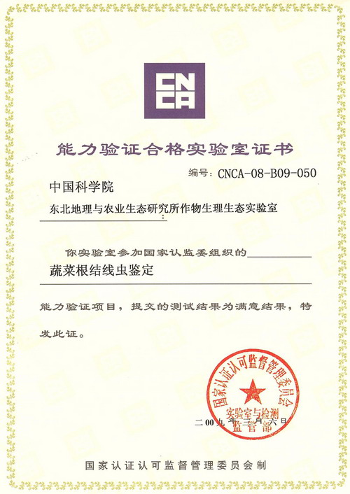 國家認證認可監(jiān)督委員會為我所頒發(fā)線蟲鑒定能力驗證合格證書