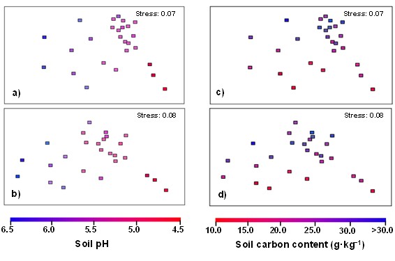 圖1 東北黑土農(nóng)田細菌群落結(jié)構(gòu)的NMDS分析。圖a和c及圖b和d是基于unweighted和weighted UniFrac群落分析結(jié)果