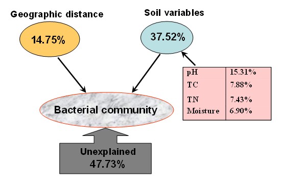 動植物在陸地生態(tài)系統(tǒng)中存在一定的地理分異規(guī)律。與動植物相比,對于陸地生態(tài)系統(tǒng)中數(shù)量巨大、種類多樣的土壤微生物而言,是否存在生物地理分布格局及其驅(qū)動因素是什么?是目前土壤學和微生物生態(tài)學研究的前沿科學問題。已有的研究結(jié)果表明,不同生態(tài)系統(tǒng)中的土壤微生物受到生物和非生物因素的雙重影響,群落結(jié)構(gòu)多樣性及群落結(jié)構(gòu)組成存在較大差異。在這些影響因素中土壤pH被普遍認為是制約土壤細菌群落結(jié)構(gòu)變化的主要因素。值得指出的是,多數(shù)研究均是基于土壤pH值差異較大的不同原始土壤進行的,而對于同一種土壤類型,土壤pH值變化較小而其它土壤理化性質(zhì)差異較大時,決定土壤微生物生物地理分布的因素是什么是一個值得探討的科學問題。