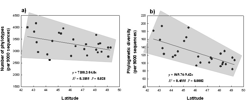 東北黑土是我國重要的土壤資源,在保障國家糧食安全和生態(tài)安全上具有重要地位。由于受氣候、開墾年限和農(nóng)田管理措施等的影響,東北黑土農(nóng)田土壤養(yǎng)分含量,特別是土壤有機質(zhì)含量呈現(xiàn)規(guī)律性的地理分布,即總體呈現(xiàn)南低北高的趨勢。但對于黑土土壤微生物是否也存在著地理分布格局?如果存在,其驅(qū)動因素是什么?還不清楚。為此,東北地理與農(nóng)業(yè)生態(tài)研究所農(nóng)田分子生態(tài)學科組王光華研究員等人,于2012年從東北黑土帶上基于土壤有機質(zhì)含量的差異,南起遼寧昌圖北至黑龍江訥河,采集了26個農(nóng)田土壤樣品,采用454高通量測序技術成功地解析了東北黑土細菌群落結(jié)構(gòu)的地理分布規(guī)律及其驅(qū)動因素。研究共獲得35萬多條細菌序列,包括至少35個細菌類群,其中酸桿菌門(Acidobacteria)、放線菌門(Actinobacteria)、變形菌門(Proteobacteria)、擬桿菌門(Bacteroidetes)、綠灣菌門(Chloroflexi)、芽單胞菌門(Gemmatimonadetes)和浮霉菌門(Planctomycetes)等7個菌門細菌為黑土農(nóng)田優(yōu)勢微生物(平均豐度>5%以上)。研究還發(fā)現(xiàn)綠灣菌門、芽單胞菌門和浮霉菌門細菌的相對豐度在黑土農(nóng)田中較以往報道的其它土壤中高出5倍以上。本研究未發(fā)現(xiàn)普遍報道的現(xiàn)象,即土壤酸桿菌門豐度與土壤pH值具有顯著的相關性,但發(fā)現(xiàn)黑土農(nóng)田中酸桿菌門中亞門1和3與土壤pH成顯著負相關,而亞門4、5、6、7和25則與土壤pH成顯著正相關關系。研究結(jié)果揭示出東北黑土農(nóng)田細菌群落結(jié)構(gòu)組成、多樣性及優(yōu)勢細菌門的相對豐度受土壤pH和土壤有機質(zhì)含量的雙重影響,且土壤pH的作用強度大于土壤有機質(zhì)(圖1)。此外,地理距離也是影響黑土農(nóng)田細菌群落結(jié)構(gòu)的另一重要因素(圖2),黑土農(nóng)田細菌群落結(jié)構(gòu)組成存在明顯的地理分布格局,低緯度低有機質(zhì)含量的黑土,雖然土壤微生物量小,但高緯度高有機質(zhì)含量的黑土相比具有更高的土壤細菌多樣性(圖3)。