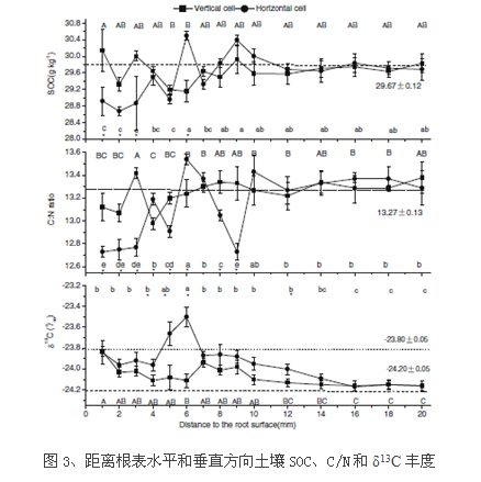 結果表明,土壤δ13C豐度由試驗前?24.20±0.05‰增加為?23.80±0.05‰,并且不同粒級土壤團聚體的δ13C豐度也有不同程度的增加。雖然>0.25 mm各粒級土壤團聚體有機碳含量沒有明顯增加,但是,在>2 mm和1~2 mm粒級團聚體中有明顯的δ13C (?23.17±0.12‰,?23.26±0.05‰) 富集信號。此外,根際沉積碳主要分布在2~20 μm土壤孔徑當量內。根際沉積碳的空間分布可以延伸到距根14 mm區域。水平方向在距根6 mm,垂直方向在距根5mm,出現根際沉積碳信號最大值。這些結果表明,根際沉積碳或其代謝產物被土壤團聚體保護,根際有明顯的遷移區域。在植物生長過程中,根際沉積調控土壤結構形成和土壤有機質的激發,這些調控機制需要進一步深入研究。