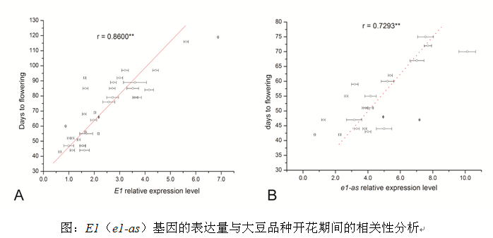大豆分子育種重點實驗室在成功地完成了大豆生育期基因E1、E2、E3及E4基因克隆的基礎上,選擇了180個具有代表性的大豆品種,同時在全國主要大豆生態(tài)區(qū)的六個試點對大豆的開花期(R1)與成熟期(R7或R8)進行了表型觀察,對四個主要生育期基因進行了基因型鑒定,其中E1、E2、E3與E4基因的隱性基因型比率分別為38.34%、84.45%、36.33%和7.20%。將我國大豆品種劃分為8個基因型類型,e1-nf、e1-asE4、E1-asE3E4、e1-asE2(E3)E4、E1、E1E4(E3)、E1E3E4和E1E2E3E4,其中E1E3E4為優(yōu)勢基因型,占26.1%,e1-nf型(E1功能缺失型)開花最早,而E1E2E3E4 基因型開花最晚。并且在研究中發(fā)現(xiàn)不同品種中E1基因的表達量與大豆開花期呈極顯著相關,說明大豆許多已知或未知的開花位點可能通過調控E1基因來控制開花的。本研究為進行深入研究大豆調控開花的基因網(wǎng)絡及開展分子育種提供重要基礎資料。
