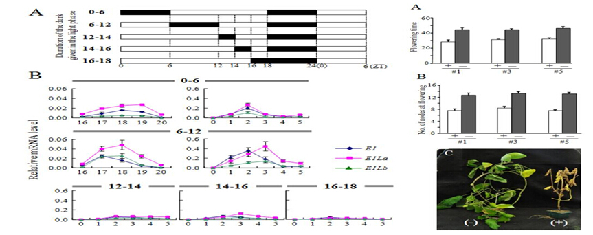 中國科學院東北地理與農業生態研究所院大豆分子設計育種重點實驗室劉寶輝研究組與北海道大學農學院植物遺傳資源講座阿部純教授合作,分析了E1基因家族和兩個FLOWERING LOCUST同源基因(FT2a與FT5a)的轉錄模式,發現長日照條件下,E1與其同源基因E1La、E1Lb 表現出兩個表達高峰;通過兩種不同的處理(一為變換光照期與暗期的實驗,二為暗中斷實驗),發現E1家族基因只在光照期表達,并且在長日照條件下,黎明后E1家族基因的表達需要前一天傍晚之前的一段時間的光照。在缺失E1基因的Toyomusume品種中,病毒誘導的E1La與E1Lb的沉默上調FT2a與FT5a的表達而使開花期提前。表明在調控大豆開花期方面, E1、E1La與 E1Lb 的功能類似。進一步的研究表明E1與E1L的表達受控于E3與E4(E3、E4編碼光敏色素A蛋白)。揭示了在光周期調控的大豆開花機制中,光敏色素A介導的E1與E1同源基因的光誘導轉錄起著關鍵作用。