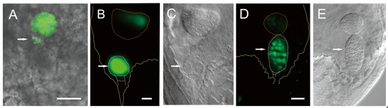 A-E:切斷胚體與胚柄的聯系后,胚柄的頂端細胞發育成為了新的胚胎,并且開始表達胚體的標記基因。A-C:胚體標記基因DRN::GFP株系,D-E:ATML::NLS:GFP株系。箭頭所示為胚柄頂部細胞發育而來的胚體結構。B,C;D,E為同一個胚珠的不同觀察模式。B,D為熒光觀察;C,E為透明觀察。
