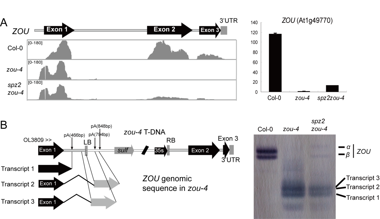 圖.SPZ2/FPA基因突變導(dǎo)致T-DNA通讀并恢復(fù)zou-4突變體中ZOU基因表達(dá)