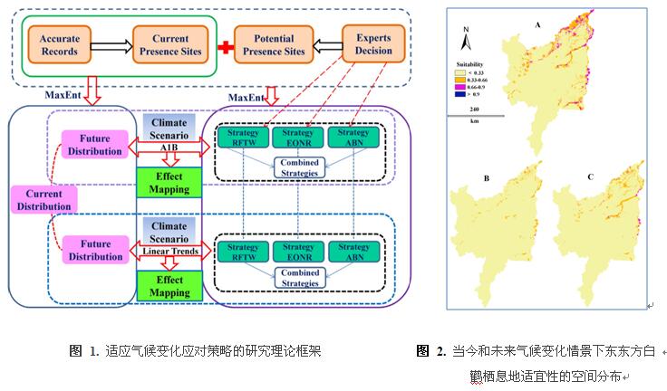 1.研究團隊(1)首次構建了針對濕地水鳥應對氣候變化策略的理論研究框架(圖1);(2)揭示了當今和未來氣候變化情景下東北地區三江平原東方白鸛棲息地適宜性的空間分布格局(圖2),表明未來氣候情境下棲息地適宜性分布面積嚴重下降;(3)揭示了不同氣候適應性策略對棲息地應對氣候變化的效益(圖3),研究顯示“退耕還濕”是最有效的適應性對策,可以使適宜性生境面積提高十倍以上;“建立自然保護區”可以提高生境適宜性六倍以上;“人工筑巢”可以提高生境適宜性二倍以上。