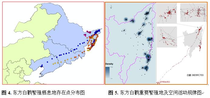 2.研究團隊2016年安裝衛星跟蹤器5個(圖4),觀測東方白鸛筑巢、覓食等生活習性,探索相關生態環境因子,明確東方白鸛繁殖重要棲息地空間分布及活動規律(圖5)