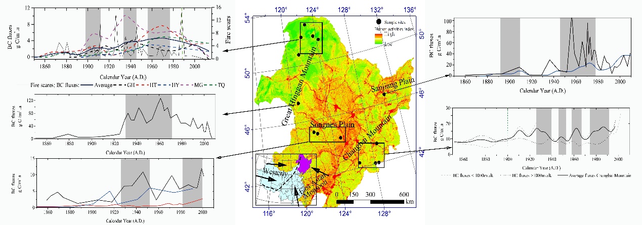 東北地理所濕地演化與生態功能學科組于2012年開始逐步開展評估黑碳對濕地生態系統碳循環影響的相關工作,目前已完成對東北地區典型濕地分布區中黑碳儲量以及近百年來黑碳沉積通量的重建工作。研究結果表明,濕地中黑碳含量約占有機碳含量的5.4%,并以此推斷全球北方泥炭地中黑碳儲量約為290億噸,相當于1100億噸二氧化碳長期穩定地儲存在泥炭地土壤碳庫中。濕地生態系統黑碳沉積過程不僅受到區域經濟發展的影響,同時也與各區域人類活動方式有著密切的關系。20世紀80年代之前,三江平原的農業資源開發和大興安嶺的林業資源開發均造成了黑碳沉積通量在當地濕地生態系統中明顯增加,其中黑碳沉積通量在部分時期超過了100g C/m2.a。隨著自然資源開發活動逐漸受到環境友好政策的限制,各區域人為活動對黑碳沉積通量影響的差異性逐漸降低,東北地區典型濕地的黑碳沉積通量主要受到區域經濟發展和工業化程度的影響。20世紀80年代以后,東北東部地區的濕地黑碳沉積通量逐漸增加并明顯高于西部地區。通過一系列研究,重建了東北地區沼澤濕地黑碳累積歷史,闡明了黑碳累積的空間分布差異,探討了黑碳累積的影響因素,增進了對東北地區沼澤濕地固碳潛力的理解。在此基礎上,首次估算了全球濕地穩定性碳(黑碳)儲存量,其明顯高于其它陸地生態系統,進一步論證了濕地生態系統的生態重要性。上述系統研究在濕地黑碳研究方面位于國際前列。