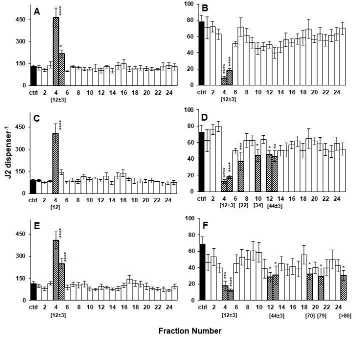 圖3線蟲對(duì)植物根滲出物RP-HPLC分離組分的趨化性;辣椒(AB)、大豆(CD)和萬壽菊(EF)
