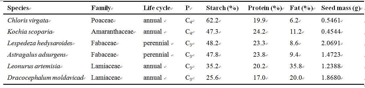 表1 六個物種所屬的科、生活型、光合途徑(P)、三大儲藏物質所占的比例及種子千粒重