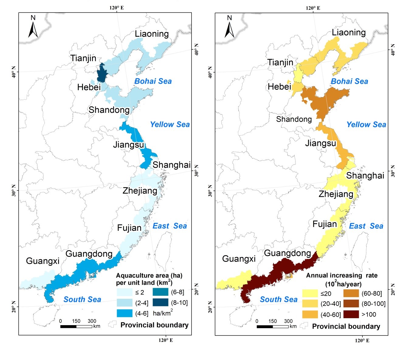 研究發現,截止到2016年,中國濱海養殖池塘擴張面積達10,463 km2 ,約為80年代初期面積的4倍,其中,廣東、山東、江蘇是濱海養殖池塘擴張的熱點地區。近32年來,大部分沿海省市養殖池塘均呈持續增加的趨勢,1990-2000年間擴張最為劇烈,且主要發生在海岸線向陸一側的10公里緩沖帶范圍內。養殖池塘擴張的主要土地覆被來源是濱海濕地(包括灘涂、紅樹林、蘆葦沼澤等)和耕地類型。政府導向的濱海土地開發政策、改革開放帶來的經濟飛速發展等是造成濱海養殖池塘快速擴張的主要驅動因素,而濱海天然濕地損失、水質惡化等則是養殖池塘擴張最直接和主要的環境影響。