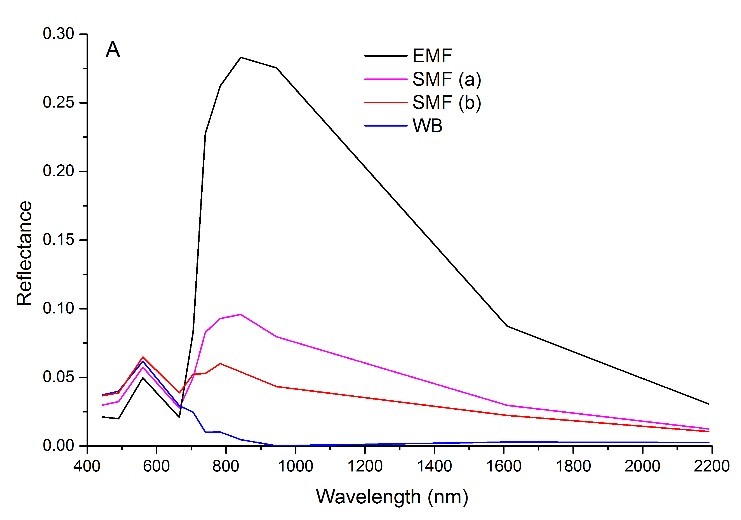 圖1. 不同潮汐狀態下紅樹林反射率曲線(EMF代表浮于水面的純紅樹林像元,SMF代表淹沒紅樹林像元,WB代表純水體像元)