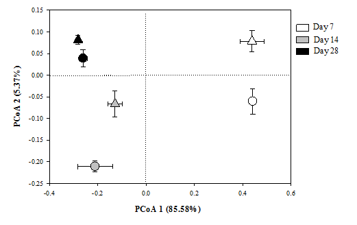 圖2正常CO2濃度(○)和CO2濃度升高(△)條件下大豆殘體在培養7天、14天、28天后土壤整體細菌群落結構PCoA圖。