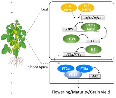 圖1 大豆光周期開(kāi)花和產(chǎn)量形成的分子模式圖 圖2 大豆適應(yīng)熱帶短日照地區(qū)的模式圖