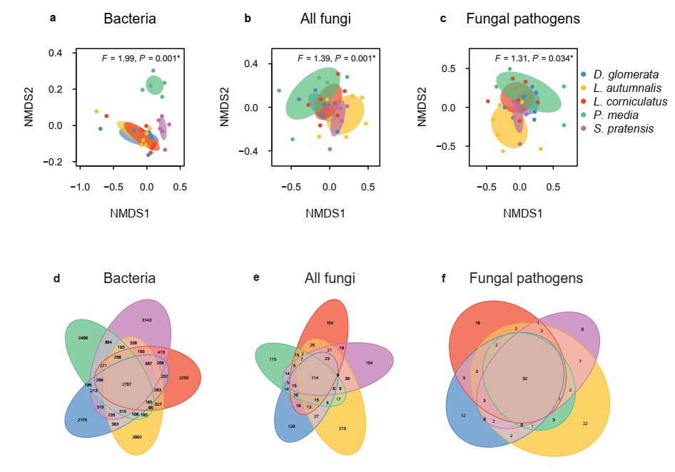 圖三 不同本地植物馴化過的土壤細菌(a,d),真菌(b,e)和真菌病原體(c,f)群落組成的差異(β多樣性和非共享的ASV)。不同顏色代表不同本地植物。NMDS圖中,不同點代表土壤樣品。
