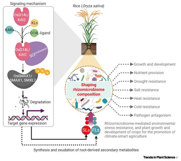 在水稻中,OsD14L(KAI2)受體結合KARs、KLs、D14L配體,與OsD3相互作用,形成SCFOsD3復合物,隨后以轉錄抑制因子OsSMAX1為靶向,進行泛素化并通過26S蛋白酶體降解,實現KAR、KLs、D14L的相關基因表達,通過SLs及FLs調控根際微生物組,進而促進植物生長發育、養分吸收、提高植物抗干擾能力。