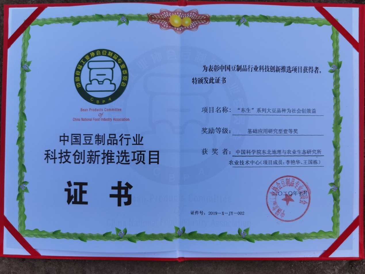 近日,2020年中國豆制品行業(yè)年會暨第七屆中國大豆食品專用原料研討會在安徽宿州召開,中國豆制品專業(yè)委員會揭曉了為中國豆制品行業(yè)發(fā)展作出突出貢獻的“2020年中國豆制品行業(yè)品牌企業(yè)50強”“中國豆制品行業(yè)科技創(chuàng)新推選項目及科技創(chuàng)新人才”名單。東北地理所寒區(qū)大豆育種學科組李艷華、王國棟的“‘東生’系列大豆為社會創(chuàng)效益”項目榮獲“基礎應用研究型”項目一等獎。