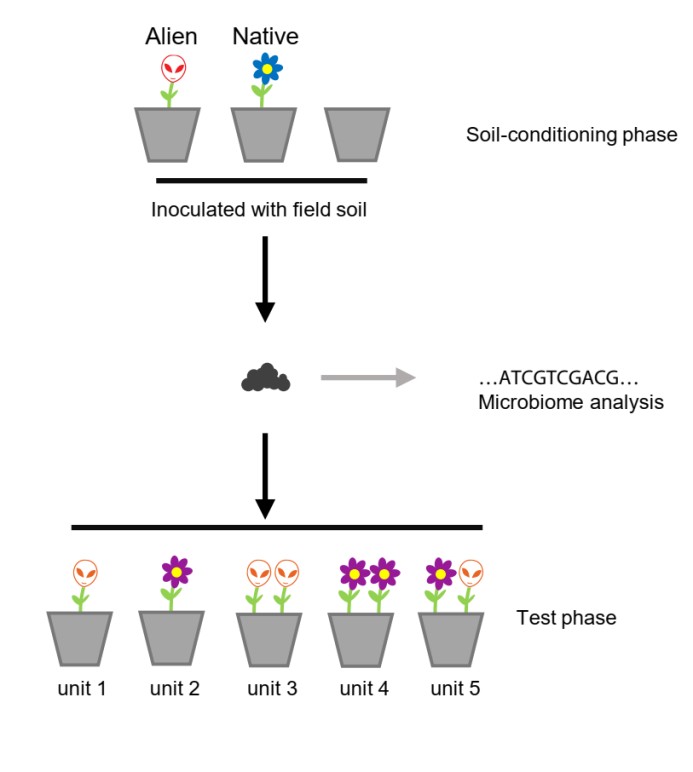 研究人員利用植物-土壤反饋的研究手段(圖1),在第一階段,選擇了4種外來(lái)植物和6種本地植物分別對(duì)土壤進(jìn)行了馴化(即隨著植物的生長(zhǎng),它會(huì)改變土壤微生物的構(gòu)成),并設(shè)置了一個(gè)沒(méi)有植物的對(duì)照。植物生長(zhǎng)15周后,研究人員收獲了土壤,并采樣進(jìn)行擴(kuò)增子測(cè)序得到土壤細(xì)菌和真菌的群落結(jié)構(gòu)。在第二階段,研究人員將新一批植物(5種外來(lái)植物和5種本地植物)種在了收獲的土壤,共設(shè)置了5個(gè)競(jìng)爭(zhēng)處理:外來(lái)/本地種的單種,外來(lái)/本地種的單物種種群,以及外來(lái)本地種的混種群落。