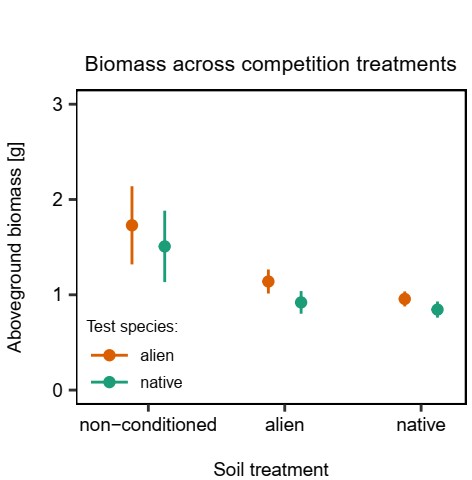 圖2 土壤馴化對(duì)外來(lái)植物(橘色)和本地植物(紫色)平均生物量的影響。 高平均生物量代表更高競(jìng)爭(zhēng)能力。在外來(lái)植物馴化的土壤上,后來(lái)的外來(lái)植物平均生物量高于后來(lái)的本地植物。