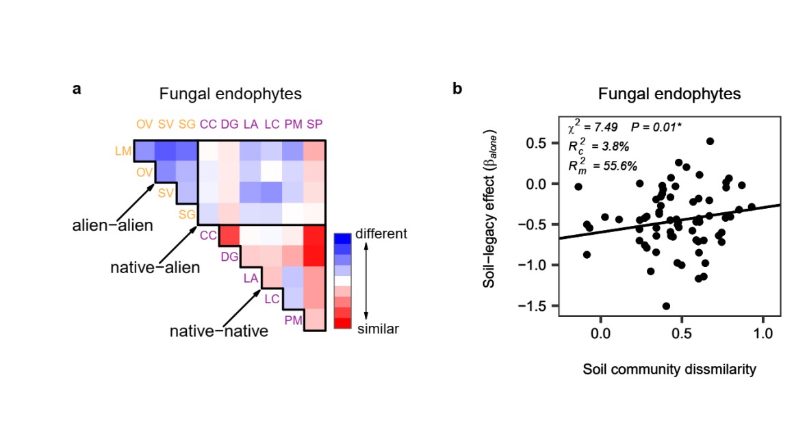圖3 不同植物土壤微生物群落的相似度(a)。藍(lán)色代表相似度低,紅色代表相似度高。左上角為外來(lái)植物之間的相似度,右下角為本地植物之間的相似度,中間為外來(lái)植物與本地植物之間的相似度。土壤微生物群落相似度與土壤遺留效應(yīng)的關(guān)系(b)。正的土壤遺留效應(yīng)代表植物對(duì)土壤馴化促進(jìn)后來(lái)植物的生長(zhǎng)。本圖僅展示內(nèi)生真菌,細(xì)菌,整體真菌的結(jié)果具有相同趨勢(shì),但不顯著,具體可見(jiàn)原文。