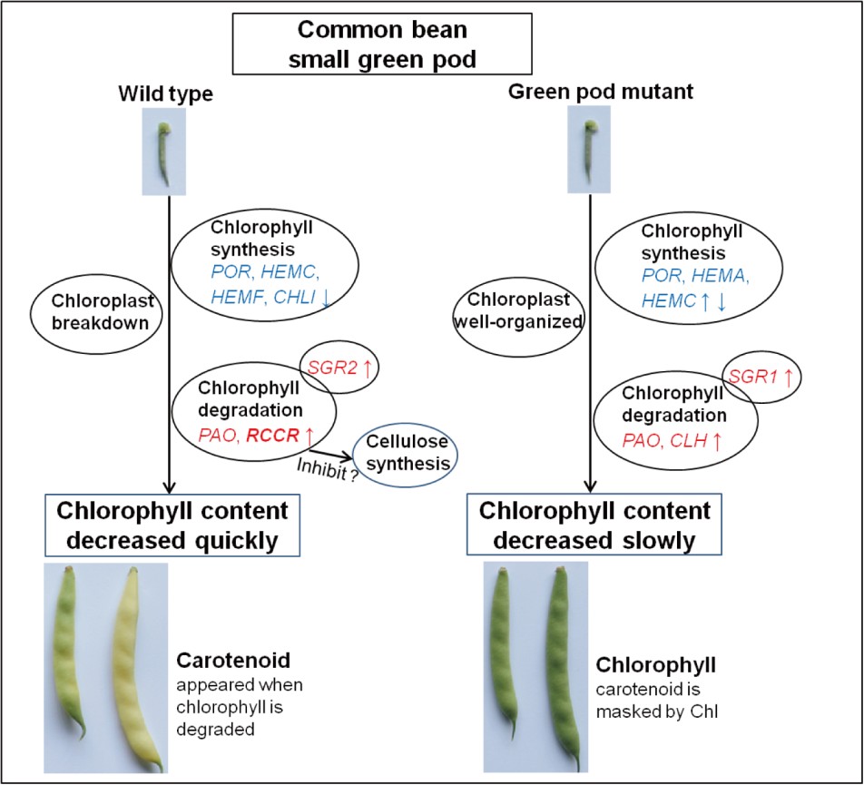野生型黃金勾的豆莢隨著生長快速褪綠變黃,而在突變體庫中出現(xiàn)較高比例的綠色豆莢突變體,該突變體的豆莢顏色一直保持綠色。為研究黃金勾豆莢褪綠及類黃酮營養(yǎng)成分的變化,對3個發(fā)育階段的豆莢進行了轉(zhuǎn)錄組和代謝組測序。隨著豆莢的發(fā)育,葉綠素含量不斷降低,在野生型黃金勾中下降速率更快。對葉綠素代謝通路分析發(fā)現(xiàn),葉綠素降解基因紅色葉綠素降解產(chǎn)物還原酶(RCCR)在黃金勾綠色小豆莢中高表達,而在綠色豆莢突變體中其表達量極低,推測該基因是黃金勾豆莢褪綠的關(guān)鍵基因。另一方面,綠色豆莢突變體豆莢質(zhì)地較硬,烹飪口感差,通過對纖維素含量進行測定,發(fā)現(xiàn)綠色豆莢突變體中纖維素含量顯著高于野生型。且與野生型相比,綠色豆莢突變體中葉纖維素合成基因表達量上調(diào)。通過豆莢代謝組研究,共檢測到154種類黃酮物質(zhì),且隨著豆莢發(fā)育,多數(shù)類黃酮物質(zhì)含量降低。在黃金勾中,柚皮苷,牡荊素-2-O-鼠李糖苷,異槲皮甙,槲皮素,山奈酚,紫云英苷和芒柄花苷含量較高。而木犀草素,芹菜素,李屬異黃酮,鷹嘴豆素,黃顏木素在綠色豆莢突變體中含量較高。該研究從生理和分子水平揭示了黃金勾豆莢褪綠的機制,并對豆莢發(fā)育過程中類黃酮物質(zhì)進行代謝分析,為解析營養(yǎng)物質(zhì)變化提供理論基礎(chǔ)。