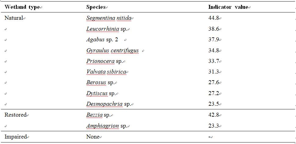 表1 三江平原自然濕地、恢復(fù)濕地和受損濕地指示物種分析結(jié)果