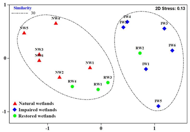 圖1 不同類型濕地水生無脊椎動(dòng)物群落組成的非度量多維尺度標(biāo)序圖