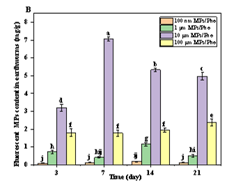 圖1. 菲 (A)和熒光微塑料(B)在蚯蚓體內(nèi)的含量。不同字母表示差異顯著(p < 0.05)。