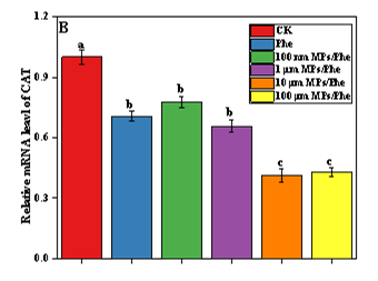 圖2. PS-MPs暴露21天后,蚯蚓體腔細胞的彗星圖像(A)和CAT基因相對量(B)。不同字母表示差異顯著(p < 0.05)。
